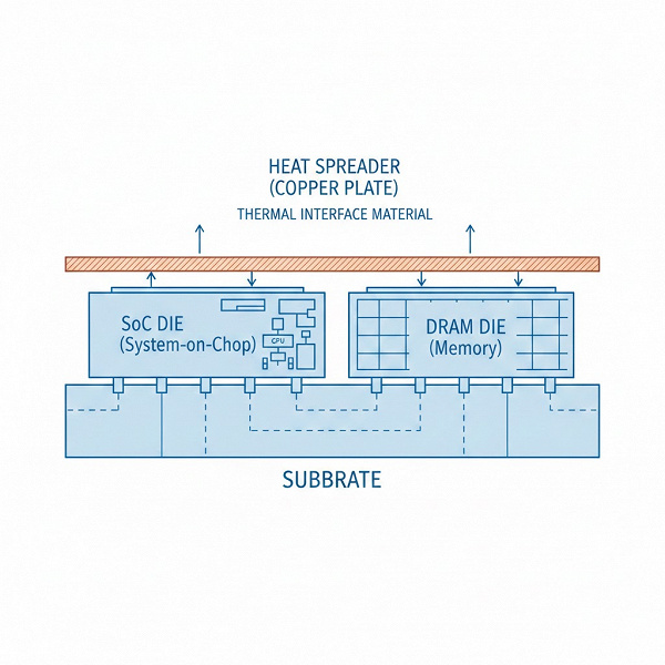 Суть в том, чтобы размещать кристалл SoC и чип DRAM не один на другой, как это обычно делают сейчас, а рядом друг с другом. Сверху всё это будет прикрываться тончайшей медной пластиной Heat Pass Block (HPB).