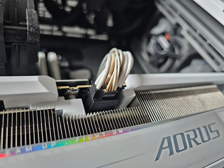 Можно видеть, что у пострадавшего была карта Gigabyte Aorus. В данном случае провода, ведущие к разъёму питания, не успели сильно повредиться, но отлично видно, по какому из них ток превысил норму.