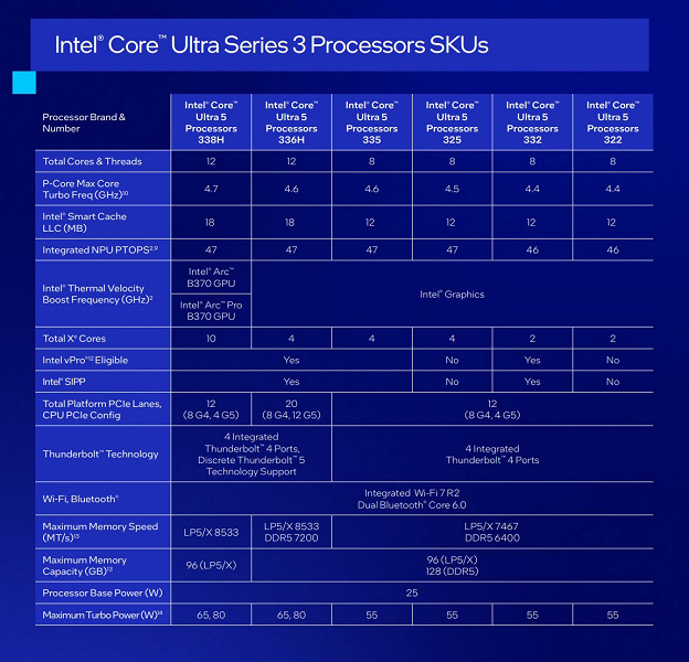 Intel вводит новые классы процессоров — Core Ultra X9 и X7. Это будут топовые модели для игровых ноутбуков и рабочих станций. Если говорить о конкретных моделях, то флагманский Core Ultra X9 388H получит 16-ядерный CPU и встроенный GPU с 12 ядрами Xe. Встроенный нейронный процессор выдает до 50 TOPS, что соответствует требованиям современных AI PC.