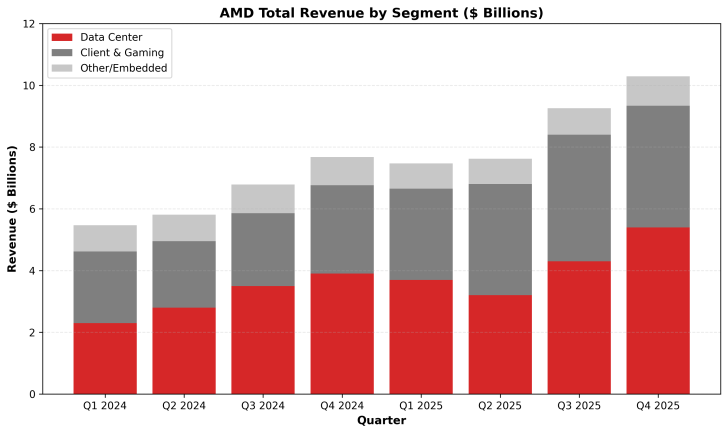 У AMD тенденция такая же, но, во-первых, компания позже вступила в гонку ускорителей для ИИ и менее успешна в ней, а во-вторых, у AMD всё же есть не только видеокарты, но и процессоры, которые как раз весьма успешны, так что пока что ситуация для обычных пользователей не так плачевна.