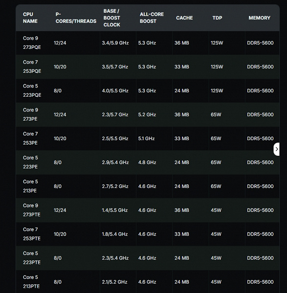Напомним, это процессоры на основе старой архитектуры Raptor Lake, но на совершенно новом кристалле, который содержит только большие ядра в количестве до 12 единиц. У оригинальных Raptor Lake, напомним, максимум было 8 больших ядер.