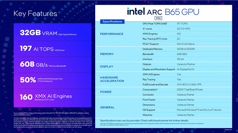 Младшая Arc Pro B65 использует урезанную конфигурацию того же GPU — 20 Xe-ядер, частота графического процессора — 2,4 ГГц. Разрядность шины памяти составляет 192 бита, энергопотребление — до 200 Вт, производительность — 197 TOPS.