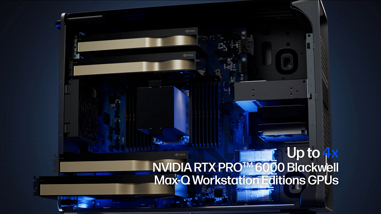 Главная особенность новинки — экстремальный объём локальной графической памяти. Каждая из RTX PRO 6000 Blackwell Max-Q имеет 96 ГБ GDDR7, то есть в максимальной конфигурации рабочая станция предлагает 384 ГБ видеопамяти.