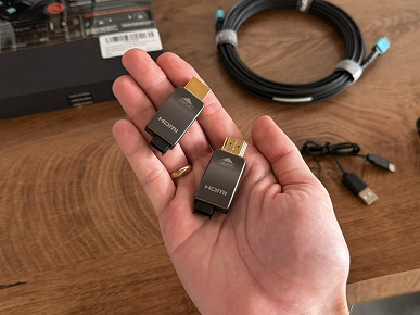 В США в продаже появился очень недешевый кабель HDMI от Ruipro. Устройство выглядит как обычный кабель, но в реальности сигнал передается по оптоволокну: электрический сигнал преобразуется в оптический на одном конце кабеля и обратно — на другом. Небольшое количество меди всё же используется — для питания и второстепенных служебных линий.