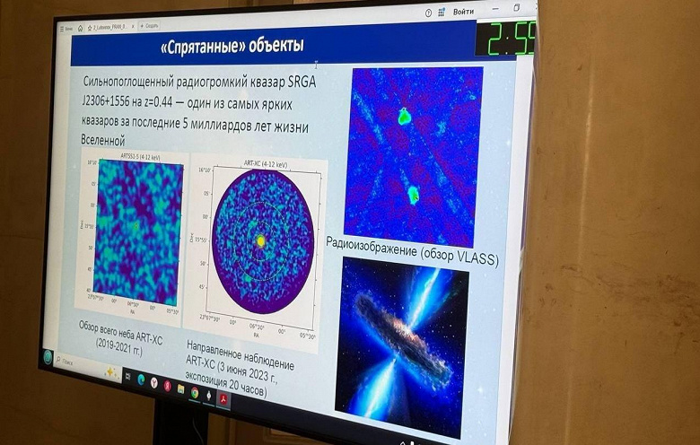 По словам Лутовинова, ученые провели специальное наблюдение и зафиксировали в центре изображения мощный источник, от которого удалось зарегистрировать несколько тысяч фотонов. На основании этих данных исследователи пришли к выводу, что речь идет об одном из самых ярких известных квазаров (SRGA J2306+1556) в рамках такого космического временного интервала.