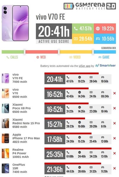 Авторы GSM Arena опубликовали обзор среднебюджетного смартфона Vivo V70 FE с большим аккумулятором. Батарея является самой интересной частью этого аппарата, и тесты показывают, что автономность у него более чем отличная.
